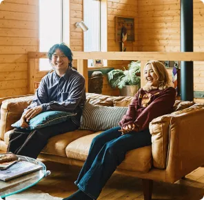 ログハウスないのソファーでくつろぐ体験者の画像
