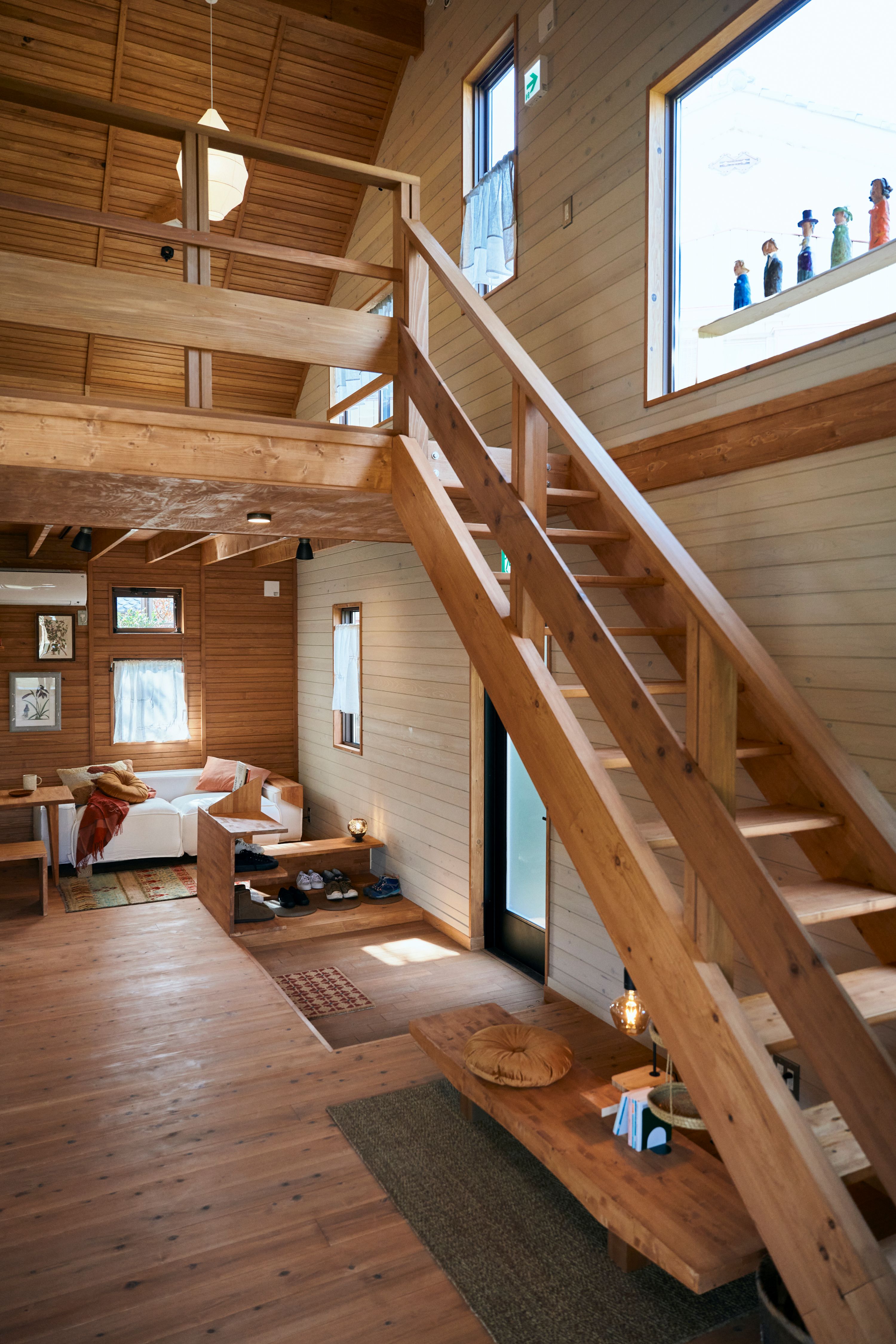 癒される香り。気持ちいい手ざわり、独特のリズム感。貫け感たっぷりの吹き抜け階段や高く開放的な三角天井、白茶色の大きな妻壁が特徴です。